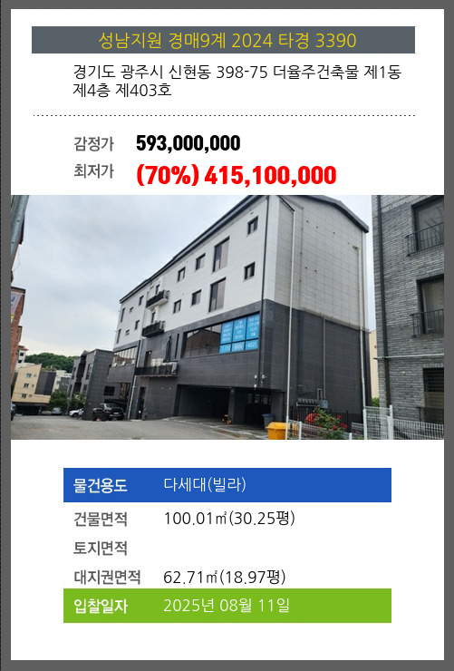 사건번호 2024 타경 3390 본건은 경기도 광주시 신현동 398-75 더율주건축물 제1동 제4층 제403호소재하는 다세대(빌라)경매 물건의 포스팅입니다. 건물면적 [ 100.01㎡ (30.25평) ]대지권 [ 62.71㎡ (18.97평) ]