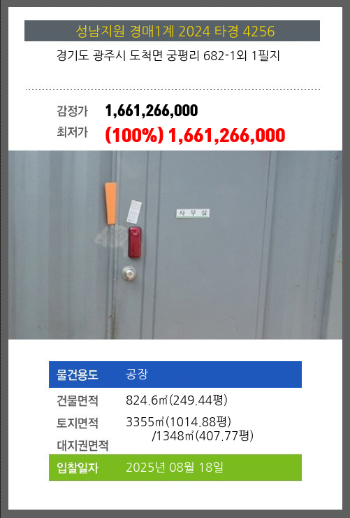사건번호 2024 타경 4256 본건은 경기도 광주시 도척면 궁평리 682-1외 1필지소재하는 공장경매 물건의 포스팅입니다. 건물면적 [ 824.6㎡ (249.44평) ]토지면적 [ 전체:3355㎡ (1014.88평) 매각지분:1348㎡ (407.77평) ]
