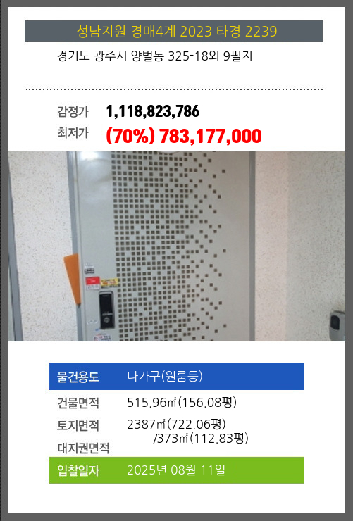 사건번호 2023 타경 2239 본건은 경기도 광주시 양벌동 325-18외 9필지소재하는 다가구(원룸등)경매 물건의 포스팅입니다. 건물면적 [ 515.96㎡ (156.08평) ]토지면적 [ 전체:2387㎡ (722.06평) 매각지분:373㎡ (112.83평) ] 시세를