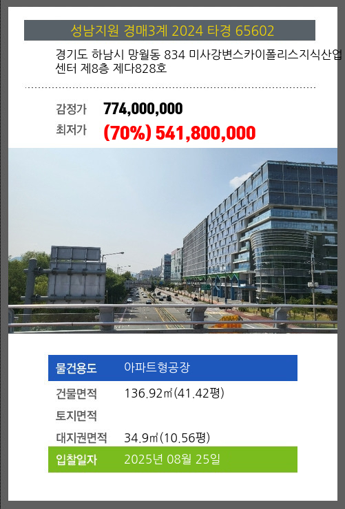 사건번호 2024 타경 65602 본건은 경기도 하남시 망월동 834 미사강변스카이폴리스지식산업센터 제8층 제다828호소재하는 아파트형공장경매 물건의 포스팅입니다. 건물면적 [ 136.92㎡ (41.42평) ]대지권 [ 34.9㎡ (10.56평) ] 시세를