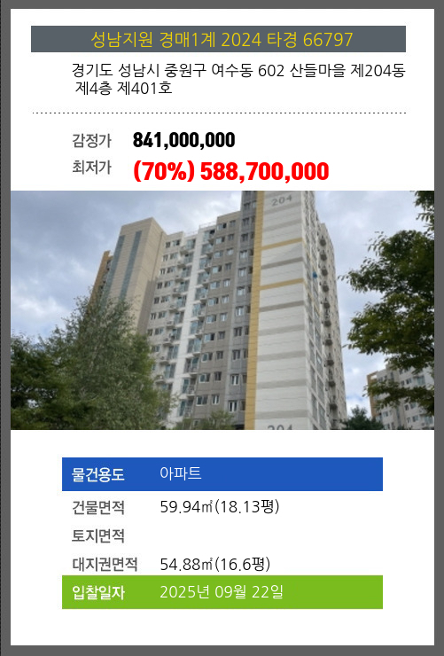 사건번호 2024 타경 66797 본건은 경기도 성남시 중원구 여수동 602 산들마을 제204동 제4층 제401호소재하는 아파트경매 물건의 포스팅입니다. 건물면적 [ 59.94㎡ (18.13평) ]대지권 [ 54.88㎡ (16.6평)