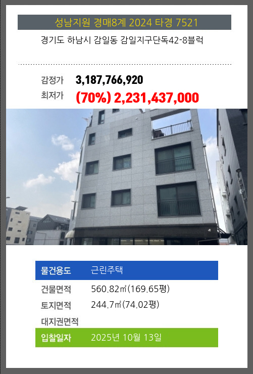 사건번호 2024 타경 7521 본건은 경기도 하남시 감일동 감일지구단독42-8블럭소재하는 근린주택경매 물건의 포스팅입니다. 건물면적 [ 560.82㎡ (169.65평) ]토지면적 [ 244.7㎡ (74.02평) ] 시세를 반영한 감정가 3,187,766,920에서1회