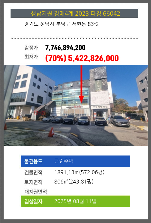 사건번호 2023 타경 66042 본건은 경기도 성남시 분당구 서현동 83-2소재하는 근린주택경매 물건의 포스팅입니다. 건물면적 [ 1891.13㎡ (572.06평) ]토지면적 [ 806㎡ (243.81평) ] 시세를 반영한 감정가