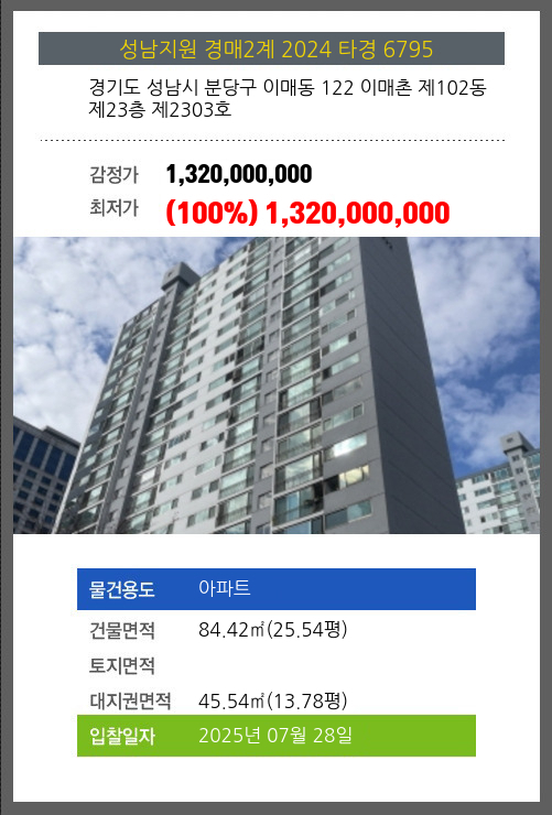 사건번호 2024 타경 6795 본건은 경기도 성남시 분당구 이매동 122 이매촌 제102동 제23층 제2303호소재하는 아파트경매 물건의 포스팅입니다. 건물면적 [ 84.42㎡ (25.54평) ]대지권 [ 45.54㎡ (13.78평)