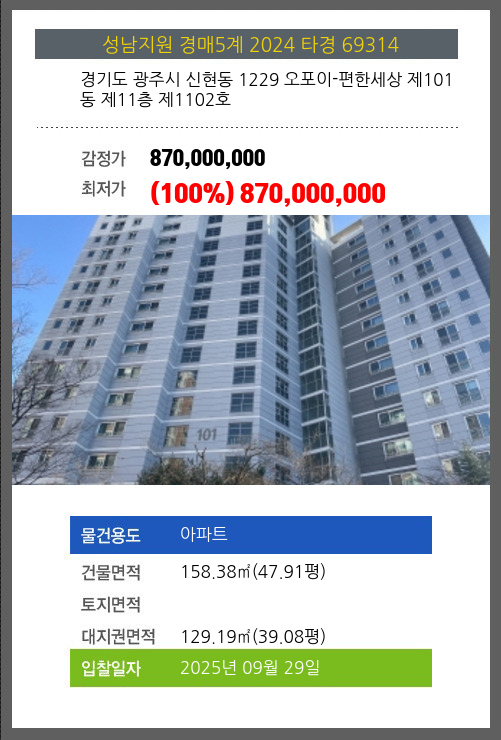 사건번호 2024 타경 69314 본건은 경기도 광주시 신현동 1229 오포이-편한세상 제101동 제11층 제1102호소재하는 아파트경매 물건의 포스팅입니다. 건물면적 [ 158.38㎡ (47.91평) ]대지권 [ 129.19㎡ (39.08평) ]