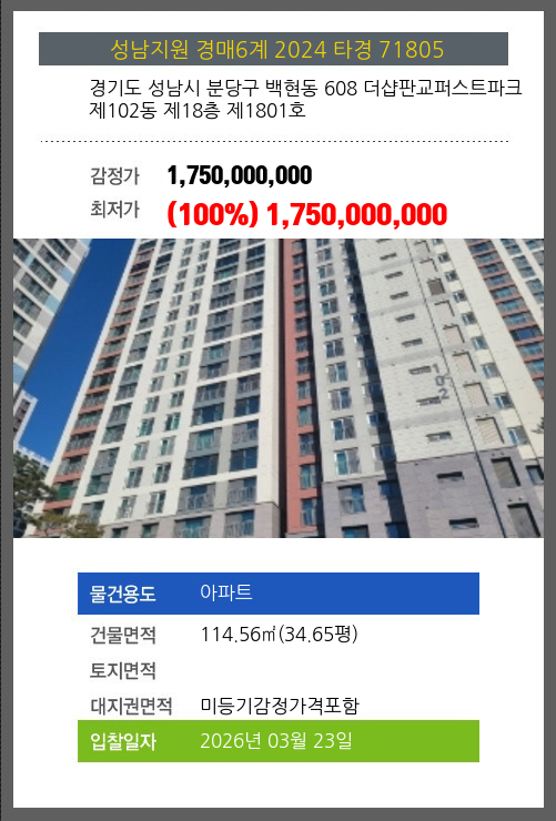 사건번호 2024 타경 71805 본건은 경기도 성남시 분당구 백현동 608 더샵판교퍼스트파크 제102동 제18층 제1801호소재하는 아파트경매 물건의 포스팅입니다. 건물면적 [ 114.56㎡ (34.65평) ]대지권 [ 미등기감정가격포함 ]
