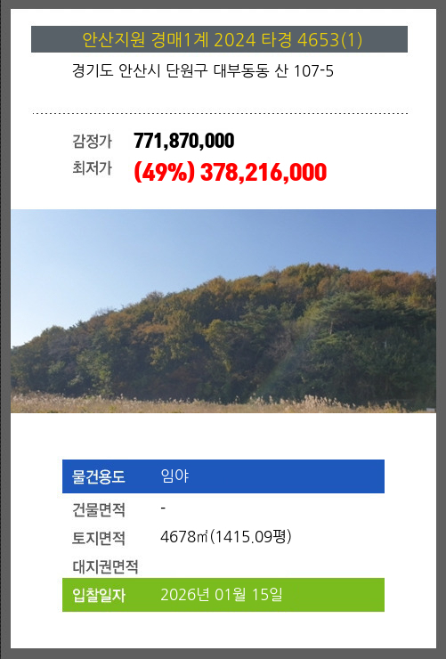 사건번호 2024 타경 4653(1) 본건은 경기도 안산시 단원구 대부동동 산 107-5소재하는 임야경매 물건의 포스팅입니다. 토지면적 [ 4678㎡ (1415.09평) ] 시세를 반영한 감정가 771,870,000에서2회 유찰되어 감정가