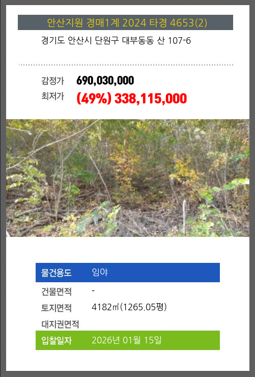사건번호 2024 타경 4653(2) 본건은 경기도 안산시 단원구 대부동동 산 107-6소재하는 임야경매 물건의 포스팅입니다. 토지면적 [ 4182㎡ (1265.05평) ] 시세를 반영한 감정가 690,030,000에서2회 유찰되어 감정가