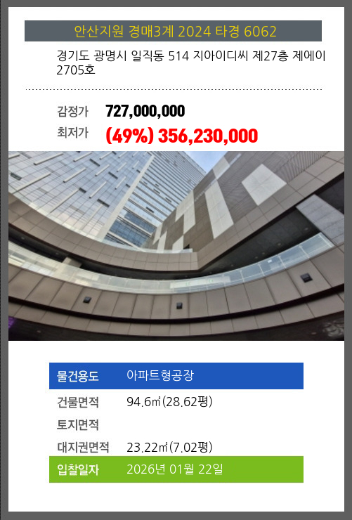 사건번호 2024 타경 6062 본건은 경기도 광명시 일직동 514 지아이디씨 제27층 제에이2705호소재하는 아파트형공장경매 물건의 포스팅입니다. 건물면적 [ 94.6㎡ (28.62평) ]대지권 [ 23.22㎡ (7.02평) ] 시세를