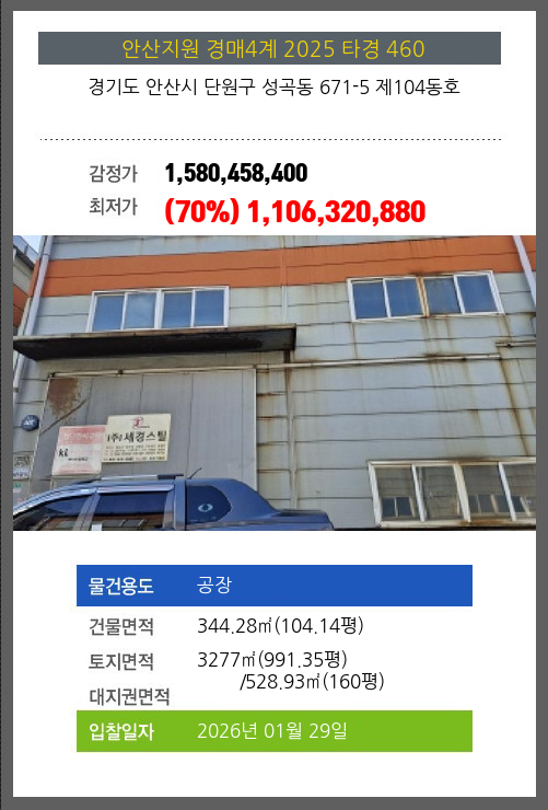 사건번호 2025 타경 460 본건은 경기도 안산시 단원구 성곡동 671-5 제104동호소재하는 공장경매 물건의 포스팅입니다. 건물면적 [ 344.28㎡ (104.14평) ]토지면적 [ 전체:3277㎡ (991.35평) 매각지분:528.93㎡ (160평) ]
