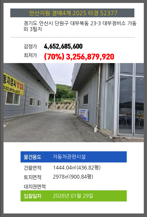 사건번호 2025 타경 52377 본건은 경기도 안산시 단원구 대부북동 23-3 대부정비소 가동외 3필지소재하는 자동차관련시설경매 물건의 포스팅입니다. 건물면적 [ 1444.04㎡ (436.82평) ]토지면적 [ 2978㎡ (900.84평) ]