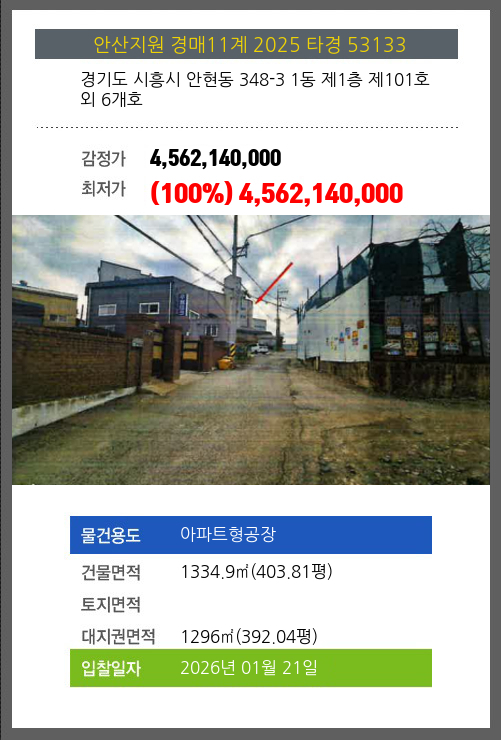 사건번호 2025 타경 53133 본건은 경기도 시흥시 안현동 348-3 1동 제1층 제101호외 6개호소재하는 아파트형공장경매 물건의 포스팅입니다. 건물면적 [ 1334.9㎡ (403.81평) ]대지권 [ 1296㎡ (392.04평) ]