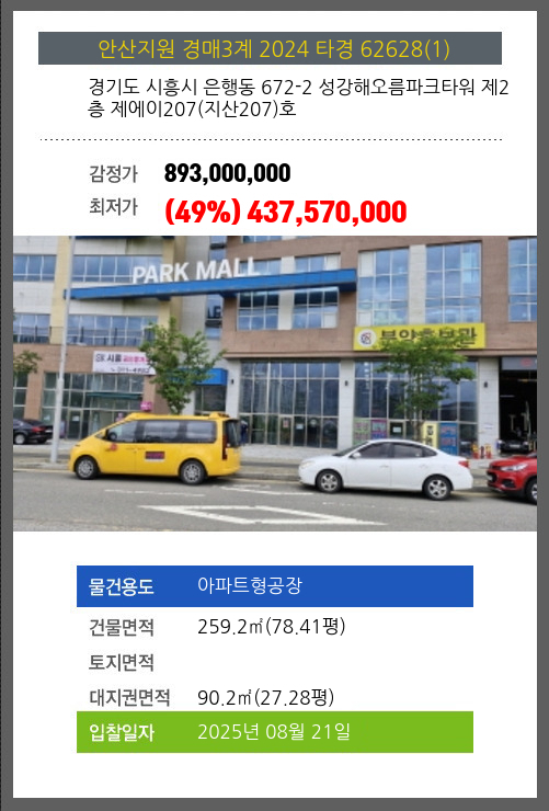 사건번호 2024 타경 62628(1) 본건은 경기도 시흥시 은행동 672-2 성강해오름파크타워 제2층 제에이207(지산207)호소재하는 아파트형공장경매 물건의 포스팅입니다. 건물면적 [ 259.2㎡ (78.41평) ]대지권 [ 90.2㎡ (27.28평) ] 시세를