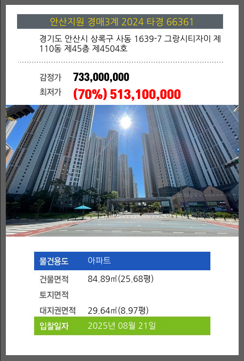 사건번호 2024 타경 66361 본건은 경기도 안산시 상록구 사동 1639-7 그랑시티자이 제110동 제45층 제4504호소재하는 아파트경매 물건의 포스팅입니다. 건물면적 [ 84.89㎡ (25.68평) ]대지권 [ 29.64㎡ (8.97평)