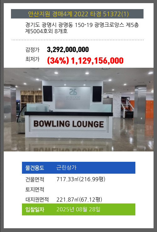 사건번호 2022 타경 51372(1) 본건은 경기도 광명시 광명동 150-19 광명크로앙스 제5층 제5004호외 8개호소재하는 근린상가경매 물건의 포스팅입니다. 건물면적 [ 717.33㎡ (216.99평) ]대지권 [ 221.87㎡ (67.12평) ]