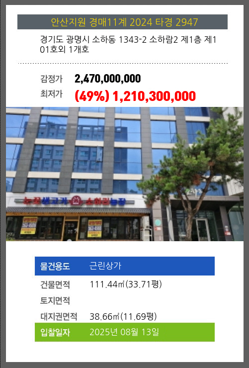 사건번호 2024 타경 2947 본건은 경기도 광명시 소하동 1343-2 소하람2 제1층 제101호외 1개호소재하는 근린상가경매 물건의 포스팅입니다. 건물면적 [ 111.44㎡ (33.71평) ]대지권 [ 38.66㎡ (11.69평) ]