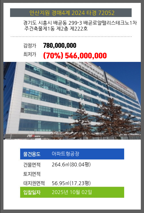사건번호 2024 타경 72052 본건은 경기도 시흥시 배곧동 299-3 배곧로얄팰리스테크노1차 주건축물제1동 제2층 제222호소재하는 아파트형공장경매 물건의 포스팅입니다. 건물면적 [ 264.6㎡ (80.04평) ]대지권 [ 56.95㎡ (17.23평) ]