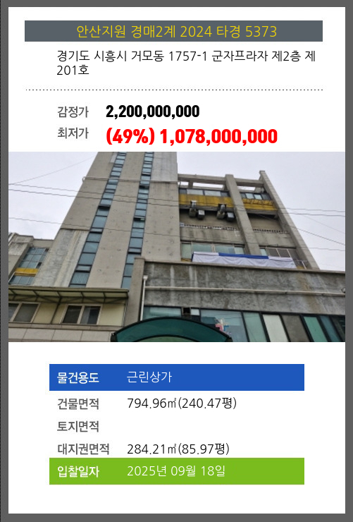 사건번호 2024 타경 5373 본건은 경기도 시흥시 거모동 1757-1 군자프라자 제2층 제201호소재하는 근린상가경매 물건의 포스팅입니다. 건물면적 [ 794.96㎡ (240.47평) ]대지권 [ 284.21㎡ (85.97평) ] 시세를