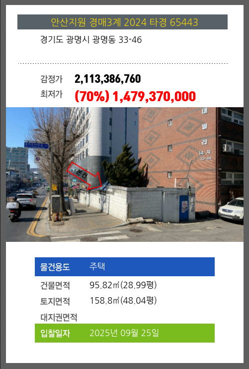 사건번호 2024 타경 65443 본건은 경기도 광명시 광명동 33-46소재하는 주택경매 물건의 포스팅입니다. 건물면적 [ 95.82㎡ (28.99평) ]토지면적 [ 158.8㎡ (48.04평) ] 시세를 반영한 감정가 2,113,386,760에서1회