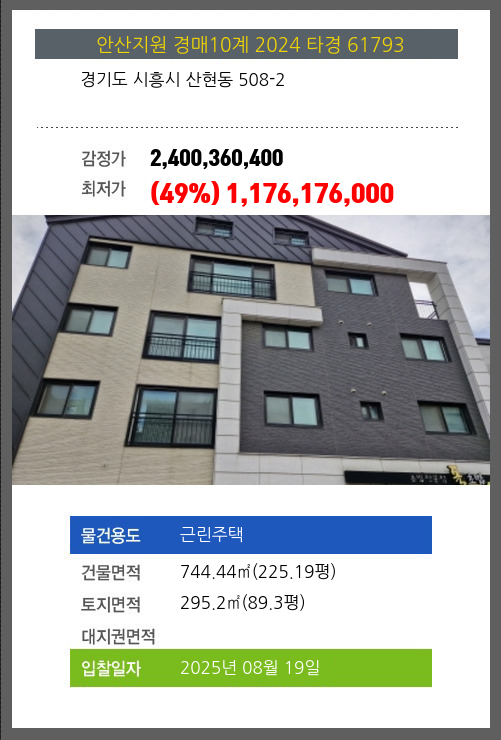사건번호 2024 타경 61793 본건은 경기도 시흥시 산현동 508-2소재하는 근린주택경매 물건의 포스팅입니다. 건물면적 [ 744.44㎡ (225.19평) ]토지면적 [ 295.2㎡ (89.3평) ] 시세를 반영한 감정가 2,400,360,400에서2회
