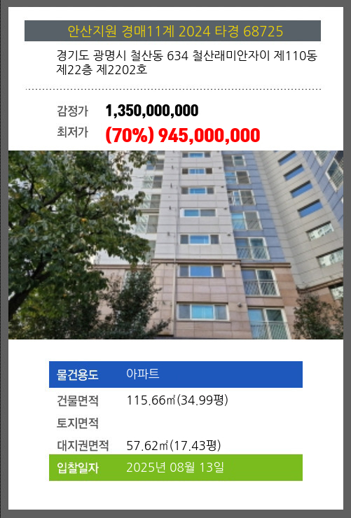 사건번호 2024 타경 68725 본건은 경기도 광명시 철산동 634 철산래미안자이 제110동 제22층 제2202호소재하는 아파트경매 물건의 포스팅입니다. 건물면적 [ 115.66㎡ (34.99평) ]대지권 [ 57.62㎡ (17.43평) ]