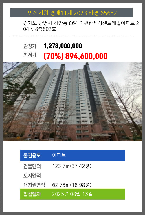 사건번호 2023 타경 65682 본건은 경기도 광명시 하안동 864 이편한세상센트레빌아파트 204동 8층802호소재하는 아파트경매 물건의 포스팅입니다. 건물면적 [ 123.7㎡ (37.42평) ]대지권 [ 62.73㎡ (18.98평) ] 시세를