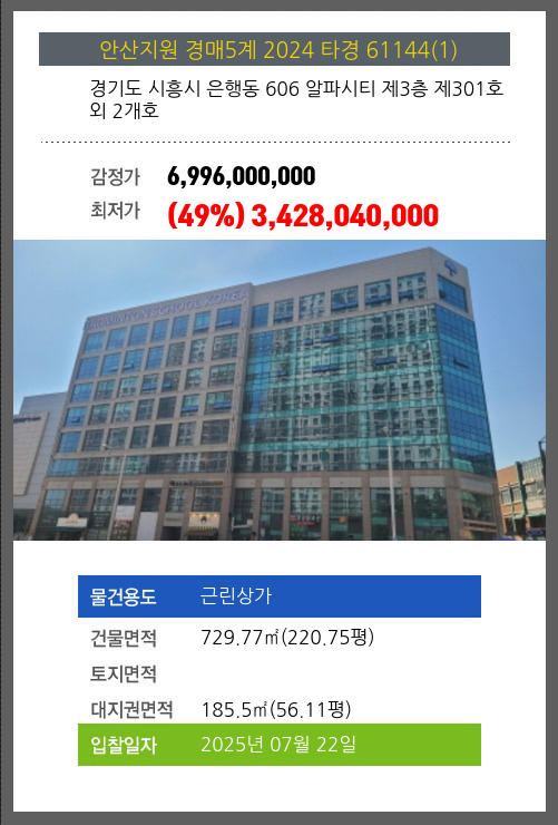 사건번호 2024 타경 61144(1) 본건은 경기도 시흥시 은행동 606 알파시티 제3층 제301호외 2개호소재하는 근린상가경매 물건의 포스팅입니다. 건물면적 [ 729.77㎡ (220.75평) ]대지권 [ 185.5㎡ (56.11평) ]