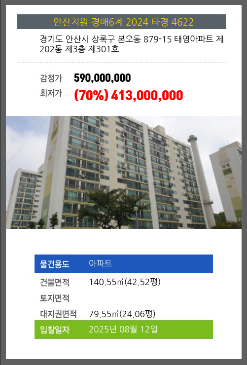 사건번호 2024 타경 4622 본건은 경기도 안산시 상록구 본오동 879-15 태영아파트 제202동 제3층 제301호소재하는 아파트경매 물건의 포스팅입니다. 건물면적 [ 140.55㎡ (42.52평) ]대지권 [ 79.55㎡ (24.06평)