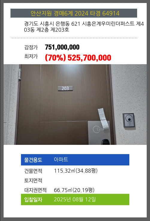 사건번호 2024 타경 64914 본건은 경기도 시흥시 은행동 621 시흥은계우미린더퍼스트 제403동 제2층 제203호소재하는 아파트경매 물건의 포스팅입니다. 건물면적 [ 115.32㎡ (34.88평) ]대지권 [ 66.75㎡ (20.19평) ]
