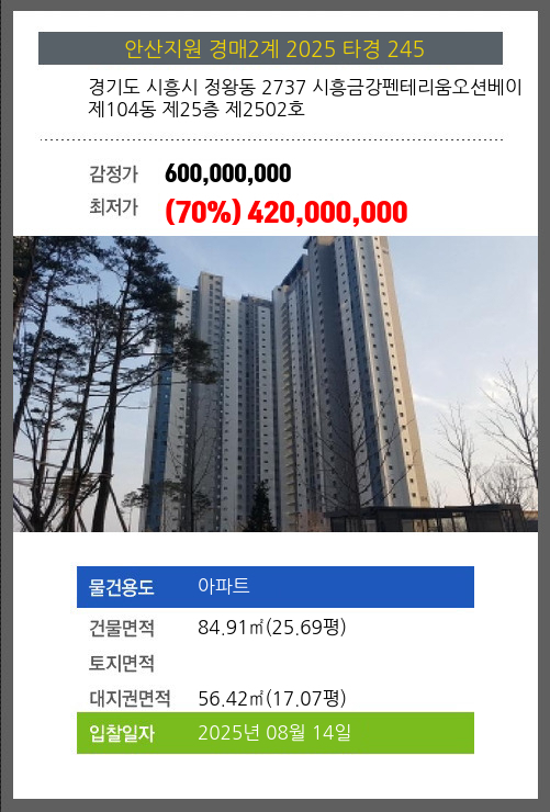 사건번호 2025 타경 245 본건은 경기도 시흥시 정왕동 2737 시흥금강펜테리움오션베이 제104동 제25층 제2502호소재하는 아파트경매 물건의 포스팅입니다. 건물면적 [ 84.91㎡ (25.69평) ]대지권 [ 56.42㎡ (17.07평) ]