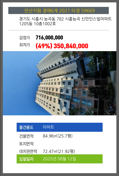 사건번호 2021 타경 59669 본건은 경기도 시흥시 능곡동 782 시흥능곡 신안인스빌아파트 1205동 10층1002호소재하는 아파트경매 물건의 포스팅입니다. 건물면적 [ 84.96㎡ (25.7평) ]대지권 [ 72.47㎡ (21.92평) ]