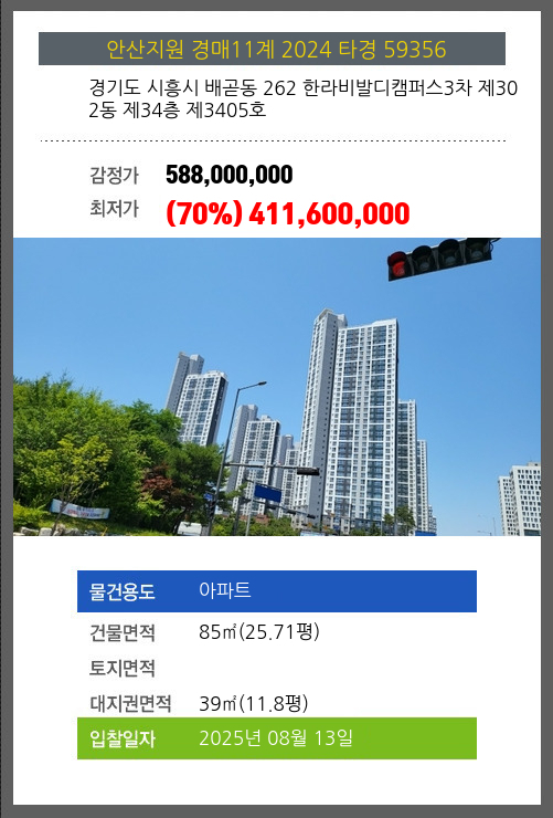 사건번호 2024 타경 59356 본건은 경기도 시흥시 배곧동 262 한라비발디캠퍼스3차 제302동 제34층 제3405호소재하는 아파트경매 물건의 포스팅입니다. 건물면적 [ 85㎡ (25.71평) ]대지권 [ 39㎡ (11.8평) ]