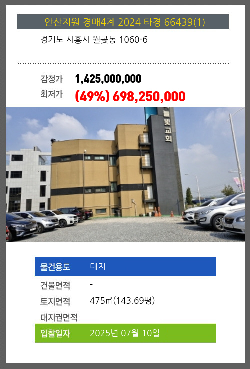 사건번호 2024 타경 66439(1) 본건은 경기도 시흥시 월곶동 1060-6소재하는 대지경매 물건의 포스팅입니다. 토지면적 [ 475㎡ (143.69평) ] 시세를 반영한 감정가 1,425,000,000에서2회 유찰되어 감정가 대비 49%최저가