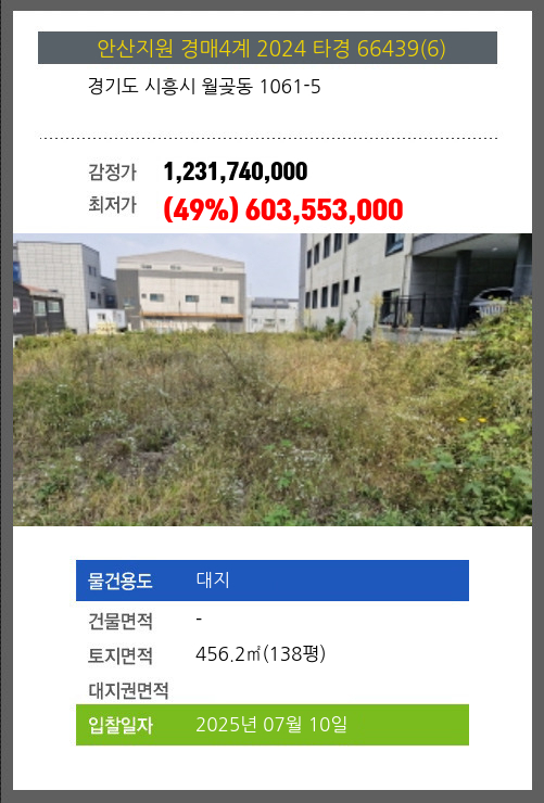 사건번호 2024 타경 66439(6) 본건은 경기도 시흥시 월곶동 1061-5소재하는 대지경매 물건의 포스팅입니다. 토지면적 [ 456.2㎡ (138평) ] 시세를 반영한 감정가 1,231,740,000에서2회 유찰되어 감정가 대비 49%최저가