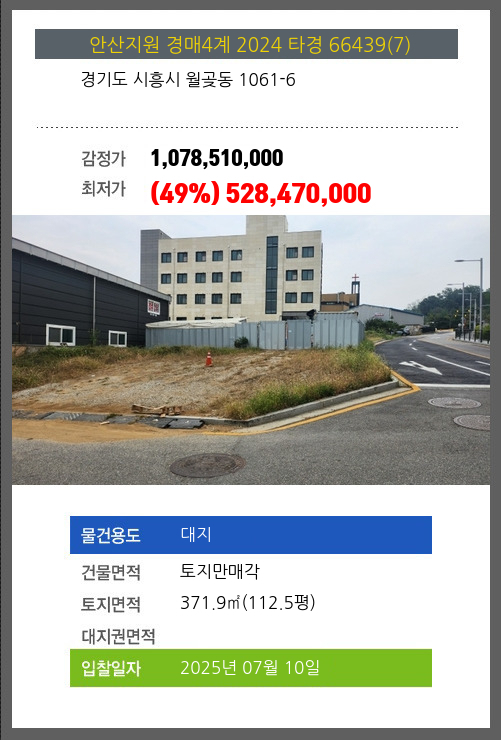 사건번호 2024 타경 66439(7) 본건은 경기도 시흥시 월곶동 1061-6소재하는 대지경매 물건의 포스팅입니다. 건물면적 [ 토지만매각 ]토지면적 [ 371.9㎡ (112.5평) ] 시세를 반영한 감정가 1,078,510,000에서2회 유찰되어
