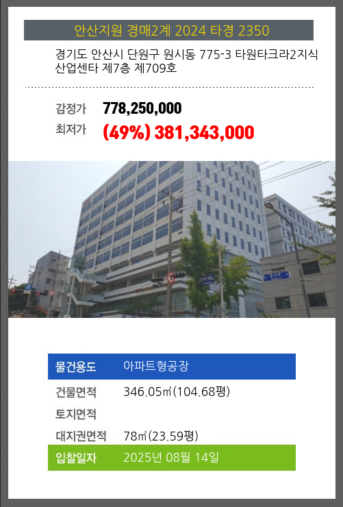 사건번호 2024 타경 2350 본건은 경기도 안산시 단원구 원시동 775-3 타원타크라2지식산업센타 제7층 제709호소재하는 아파트형공장경매 물건의 포스팅입니다. 건물면적 [ 346.05㎡ (104.68평) ]대지권 [ 78㎡ (23.59평) ]