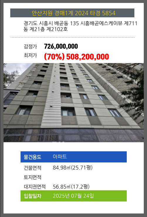 사건번호 2024 타경 5854 본건은 경기도 시흥시 배곧동 135 시흥배곧에스케이뷰 제711동 제21층 제2102호소재하는 아파트경매 물건의 포스팅입니다. 건물면적 [ 84.98㎡ (25.71평) ]대지권 [ 56.85㎡ (17.2평) ]