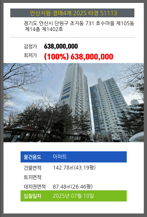 사건번호 2025 타경 51113 본건은 경기도 안산시 단원구 초지동 731 호수마을 제105동 제14층 제1402호소재하는 아파트경매 물건의 포스팅입니다. 건물면적 [ 142.78㎡ (43.19평) ]대지권 [ 87.48㎡ (26.46평)
