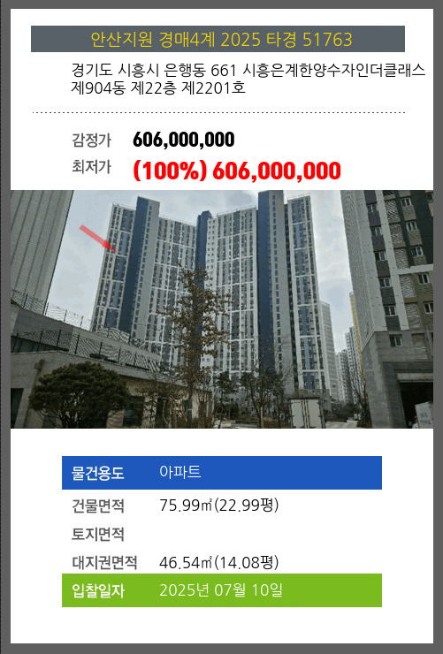 사건번호 2025 타경 51763 본건은 경기도 시흥시 은행동 661 시흥은계한양수자인더클래스 제904동 제22층 제2201호소재하는 아파트경매 물건의 포스팅입니다. 건물면적 [ 75.99㎡ (22.99평) ]대지권 [ 46.54㎡ (14.08평) ]