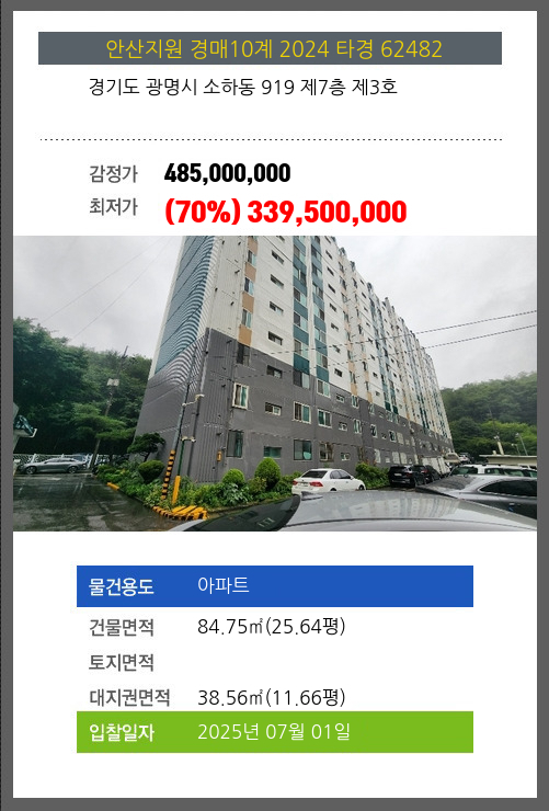 사건번호 2024 타경 62482 본건은 경기도 광명시 소하동 919 제7층 제3호소재하는 아파트경매 물건의 포스팅입니다. 건물면적 [ 84.75㎡ (25.64평) ]대지권 [ 38.56㎡ (11.66평) ] 시세를 반영한