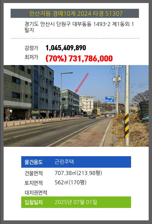 사건번호 2024 타경 51307 본건은 경기도 안산시 단원구 대부동동 1493-2 제1동외 1필지소재하는 근린주택경매 물건의 포스팅입니다. 건물면적 [ 707.38㎡ (213.98평) ]토지면적 [ 562㎡ (170평) ] 시세를