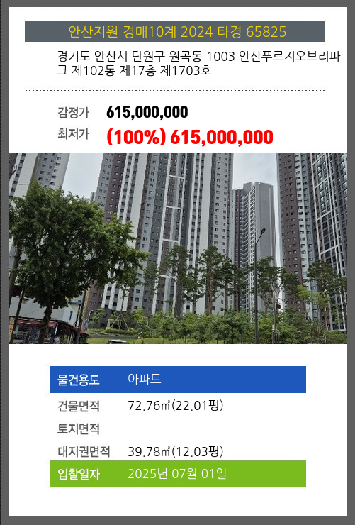 사건번호 2024 타경 65825 본건은 경기도 안산시 단원구 원곡동 1003 안산푸르지오브리파크 제102동 제17층 제1703호소재하는 아파트경매 물건의 포스팅입니다. 건물면적 [ 72.76㎡ (22.01평) ]대지권 [ 39.78㎡ (12.03평)