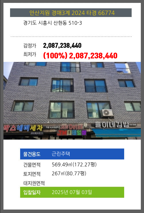 사건번호 2024 타경 66774 본건은 경기도 시흥시 산현동 510-3소재하는 근린주택경매 물건의 포스팅입니다. 건물면적 [ 569.49㎡ (172.27평) ]토지면적 [ 267㎡ (80.77평) ] 시세를 반영한 감정가 2,087,238,440에서신건으로