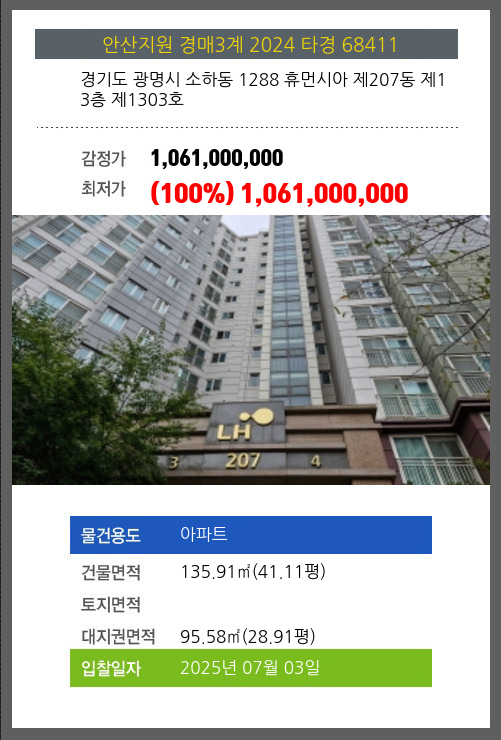 사건번호 2024 타경 68411 본건은 경기도 광명시 소하동 1288 휴먼시아 제207동 제13층 제1303호소재하는 아파트경매 물건의 포스팅입니다. 건물면적 [ 135.91㎡ (41.11평) ]대지권 [ 95.58㎡ (28.91평) ]