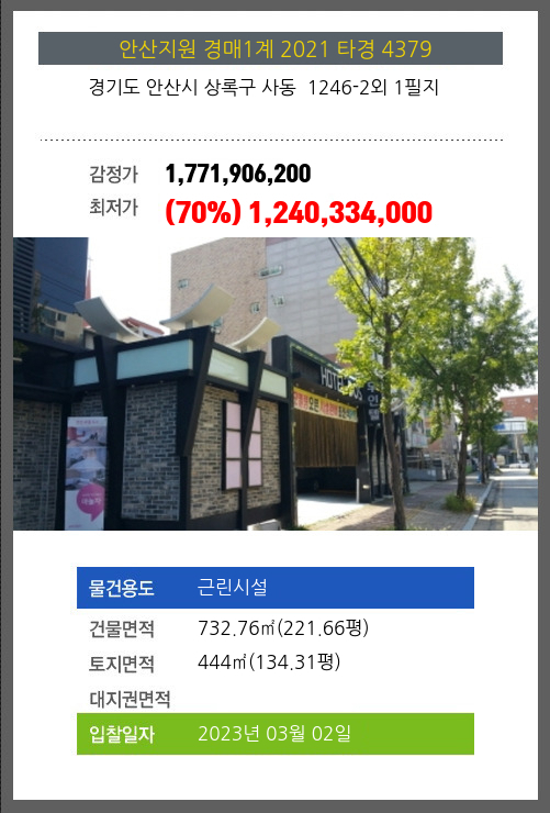 사건번호 2021 타경 4379 본건은 경기도 안산시 상록구 사동 1246-2외 1필지소재하는 근린시설경매 물건의 포스팅입니다. 건물면적 [ 732.76㎡ (221.66평) ]토지면적 [ 444㎡ (134.31평) ] 시세를 반영한