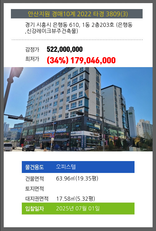 사건번호 2022 타경 3809(3) 본건은 경기 시흥시 은행동 610, 1동 2층203호 (은행동,신강레이크뷰주건축물)소재하는 오피스텔경매 물건의 포스팅입니다. 건물면적 [ 63.96㎡ (19.35평) ]대지권 [ 17.58㎡ (5.32평) ] 시세를