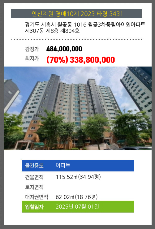 사건번호 2023 타경 3431 본건은 경기도 시흥시 월곶동 1016 월곶3차풍림아이원아파트 제307동 제8층 제804호소재하는 아파트경매 물건의 포스팅입니다. 건물면적 [ 115.52㎡ (34.94평) ]대지권 [ 62.02㎡ (18.76평) ]