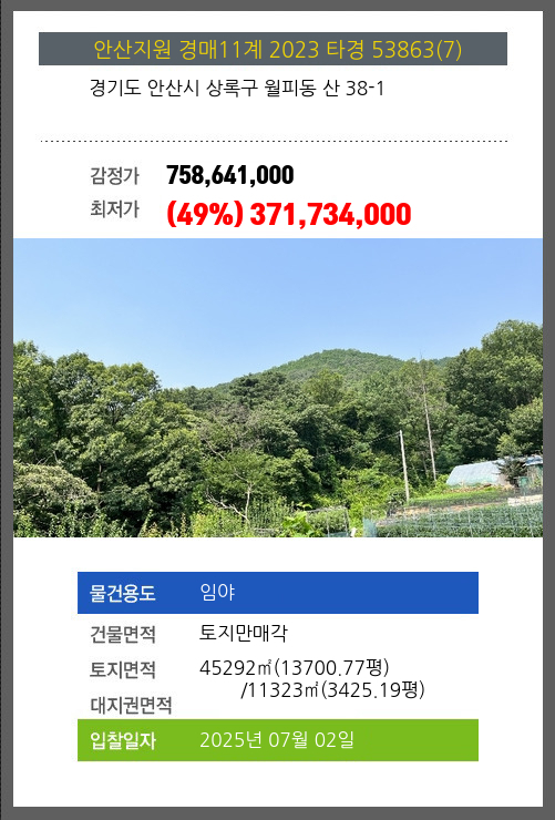 사건번호 2023 타경 53863(7) 본건은 경기도 안산시 상록구 월피동 산 38-1소재하는 임야경매 물건의 포스팅입니다. 건물면적 [ 토지만매각 ]토지면적 [ 전체:45292㎡ (13700.77평) 매각지분:11323㎡ (3425.19평) ] 시세를