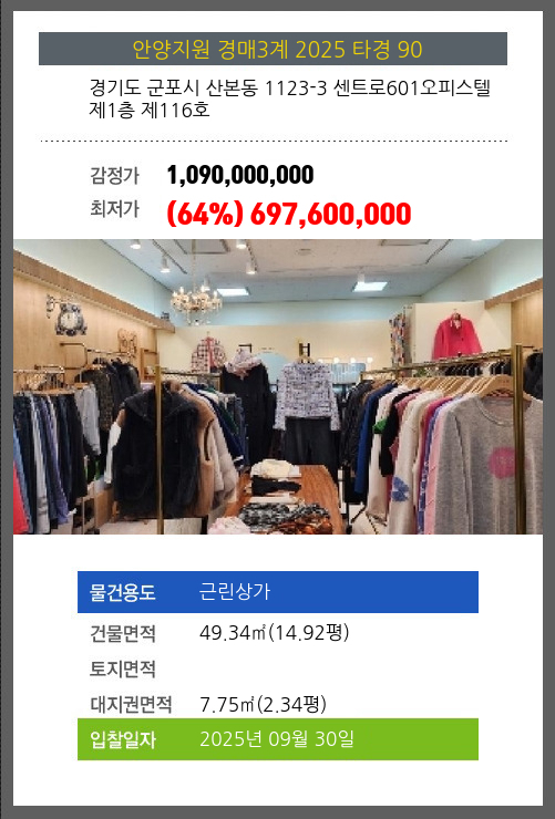 사건번호 2025 타경 90 본건은 경기도 군포시 산본동 1123-3 센트로601오피스텔 제1층 제116호소재하는 근린상가경매 물건의 포스팅입니다. 건물면적 [ 49.34㎡ (14.92평) ]대지권 [ 7.75㎡ (2.34평) ] 시세를