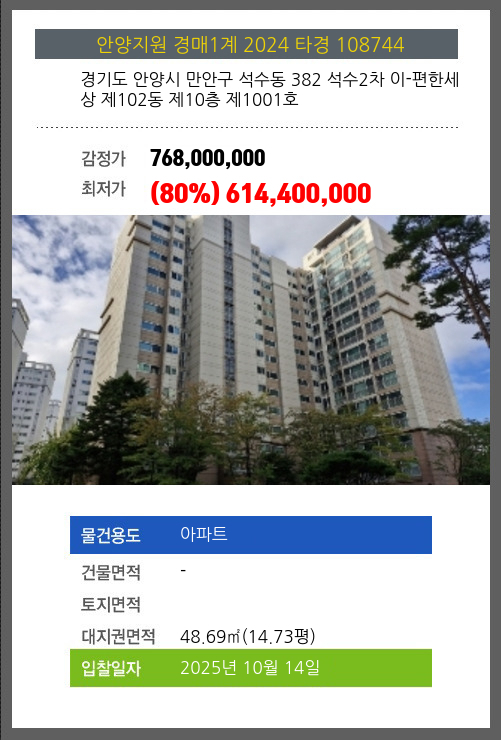 사건번호 2024 타경 108744 본건은 경기도 안양시 만안구 석수동 382 석수2차 이-편한세상 제102동 제10층 제1001호소재하는 아파트경매 물건의 포스팅입니다. 대지권 [ 48.69㎡ (14.73평) ] 시세를 반영한